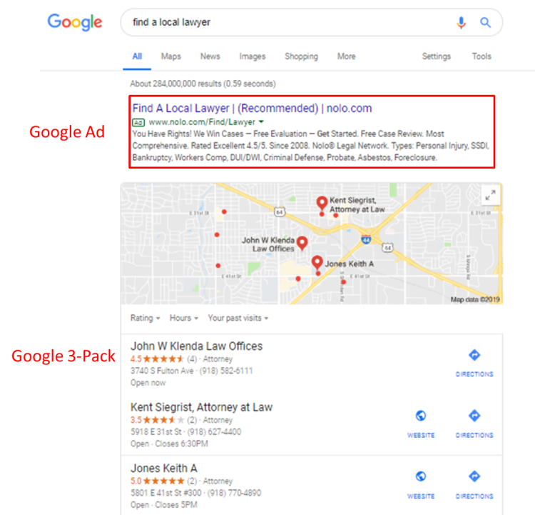 Google’s 3-Pack is the three listings that appear on the Google Maps feature of the first page results. This Maps feature shows up for approximately 30% of all local searches. However, it is one of the most clicked areas on the search engine results page (SERP).