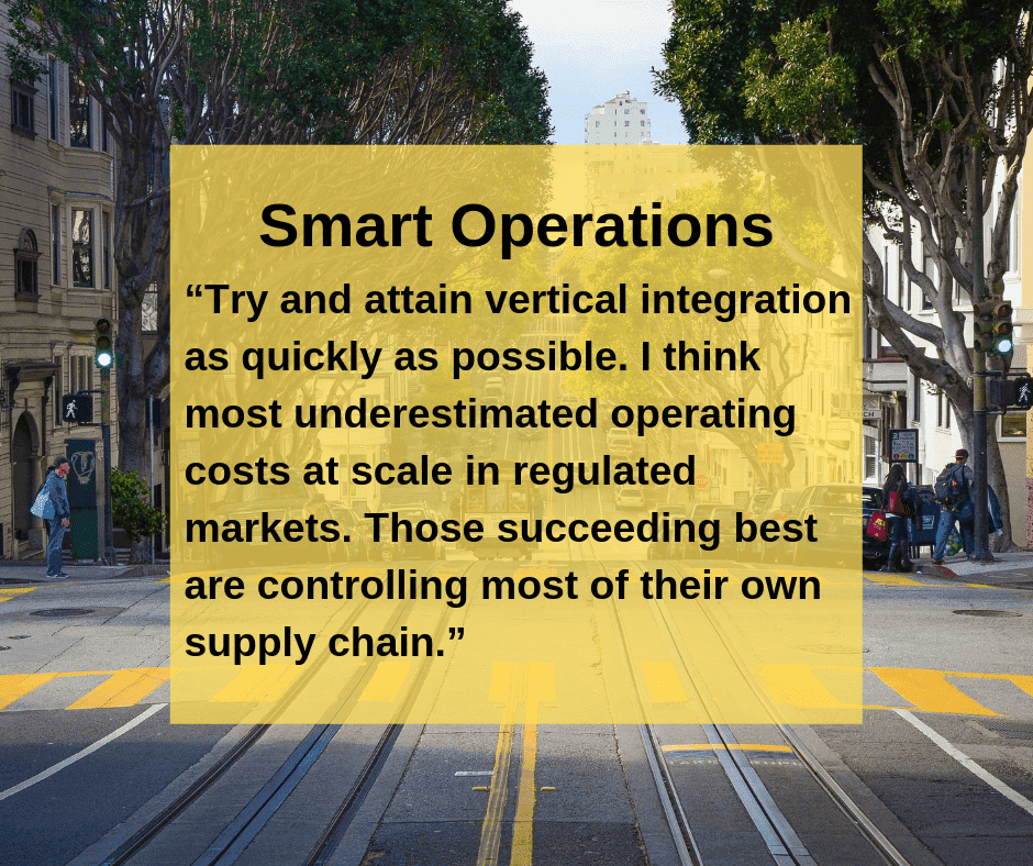 Andrew Kaufman, a cannabis business professional says, “Try and attain vertical integration as quickly as possible. I think most underestimated operating costs at scale in regulated markets. Those succeeding best are controlling most of their own supply chain.”