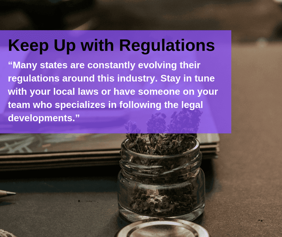 Knowing your local regulations is imperative to keep your business on the right track. “Many states are constantly evolving their regulations around this industry. Stay in tune with your local laws or have someone on your team who specializes in following the legal developments,” says Jenny Proehl-Day, principal at the Proehl-Day Law Firm